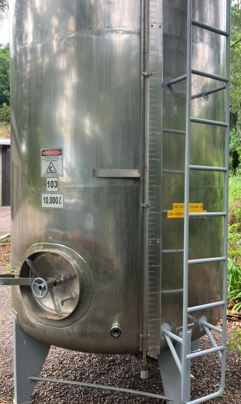 Tanque Reservatório Vertical com capacidade de 10.000 Litros. Equipamento fabricado em Aço Inox AISI 304 com acabamento lixado, ideal para armazenamento de água, produtos químicos, xaropes ou bebidas em geral. Destaca-se pela robustez estrutural, utilizando chapas de espessura superior à média de mercado.